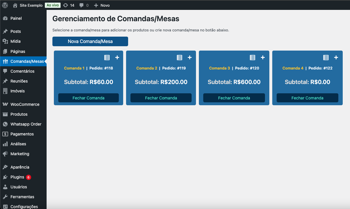 Este plugin funciona diretamente com o plugin do Wocoommerce, permitindo que o Gerente de Loja, possa fazer a gestão dos pedidos e associar a mesa/comanda desejada.